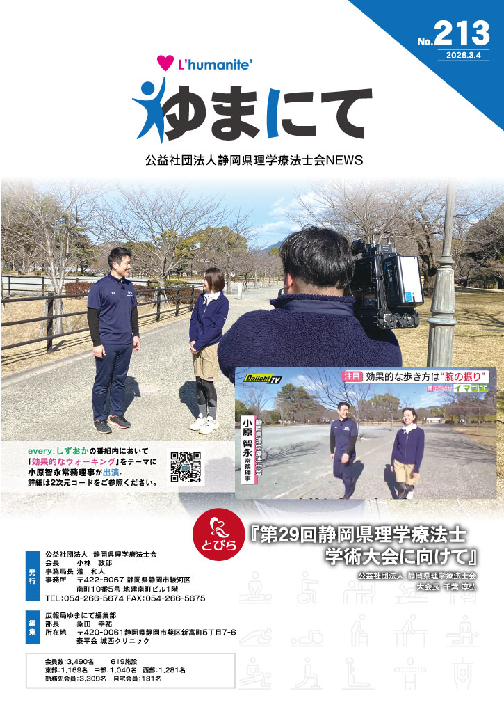広報誌「ゆまにて」 ホーム > ゆまにて > 177号(2019.11.6) 年6回発行の広報誌「ゆまにて」を通じて、皆さまへ静岡県理学療法士会の活動をお伝えしております。 *ゆまにて(humanité)とは・・・人、人類、人間性等を表すフランス語です。 ゆまにて 最新号 213号(2026.3.4) 掲載内容 213号(2026.3.4)